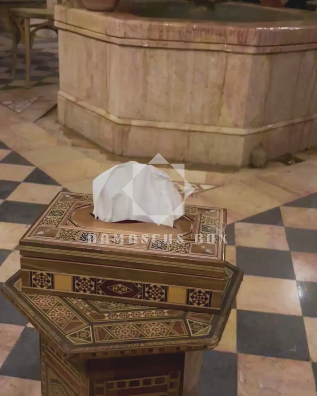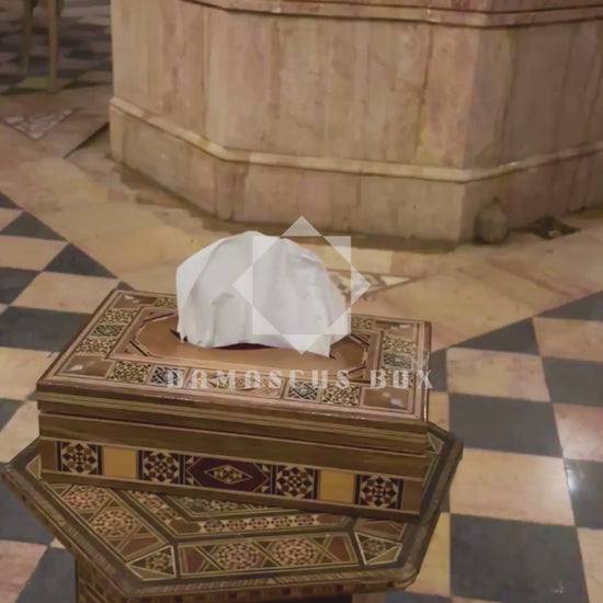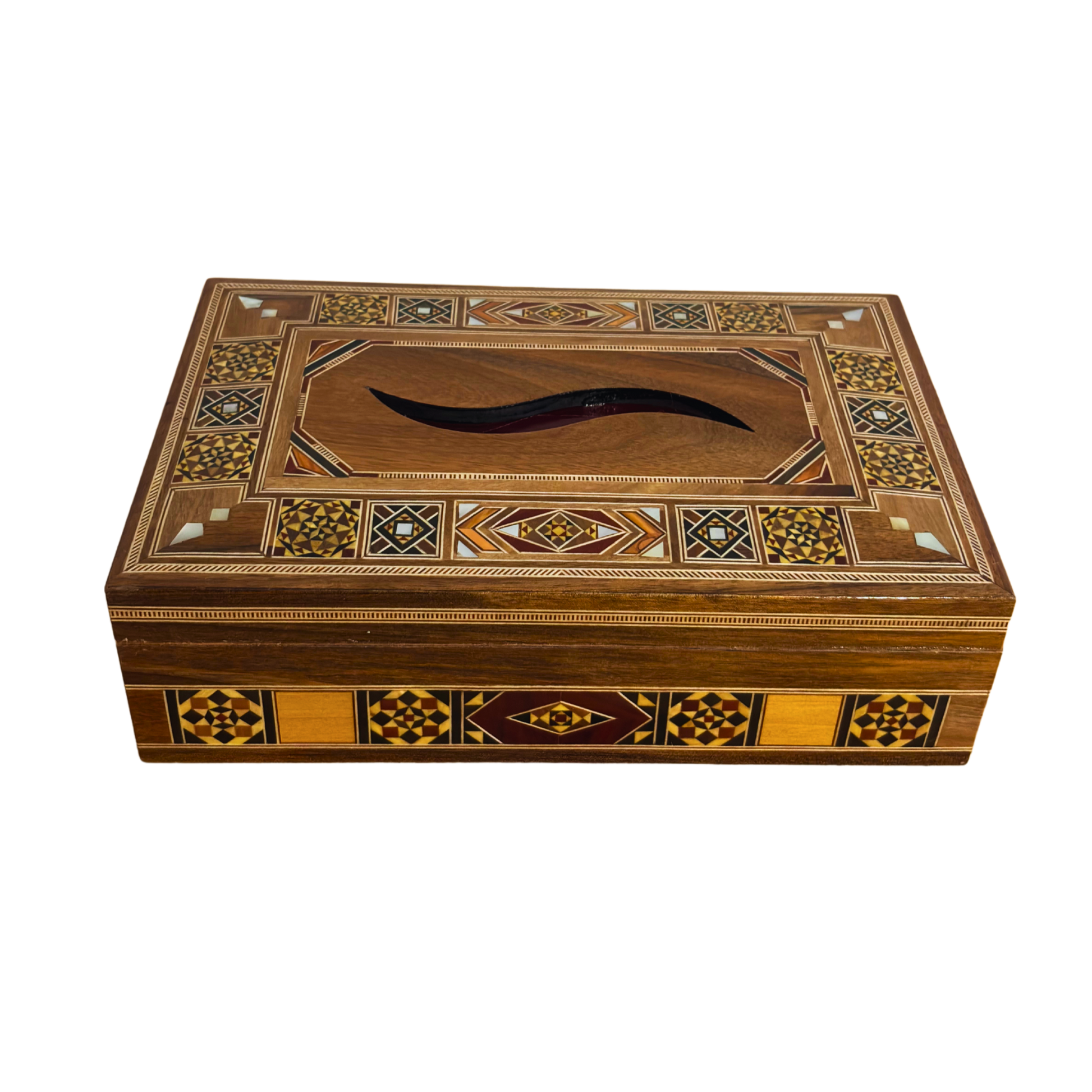 Diese handgefertigte Taschentuchbox verkörpert die zeitlose Kunst der Damaszener Mosaikarbeit.