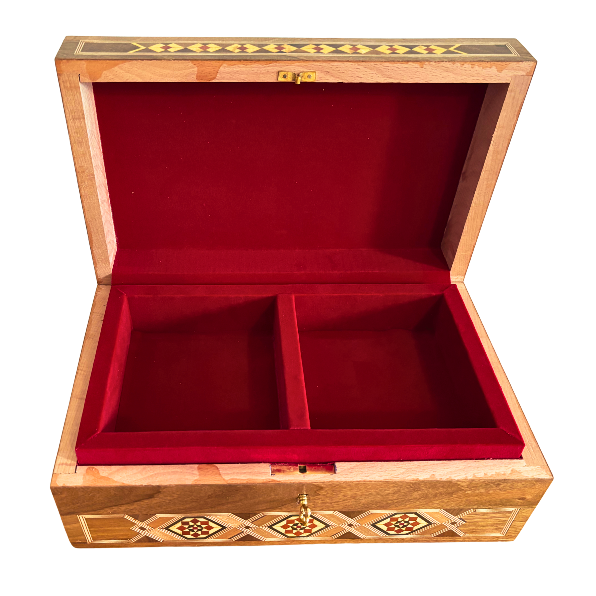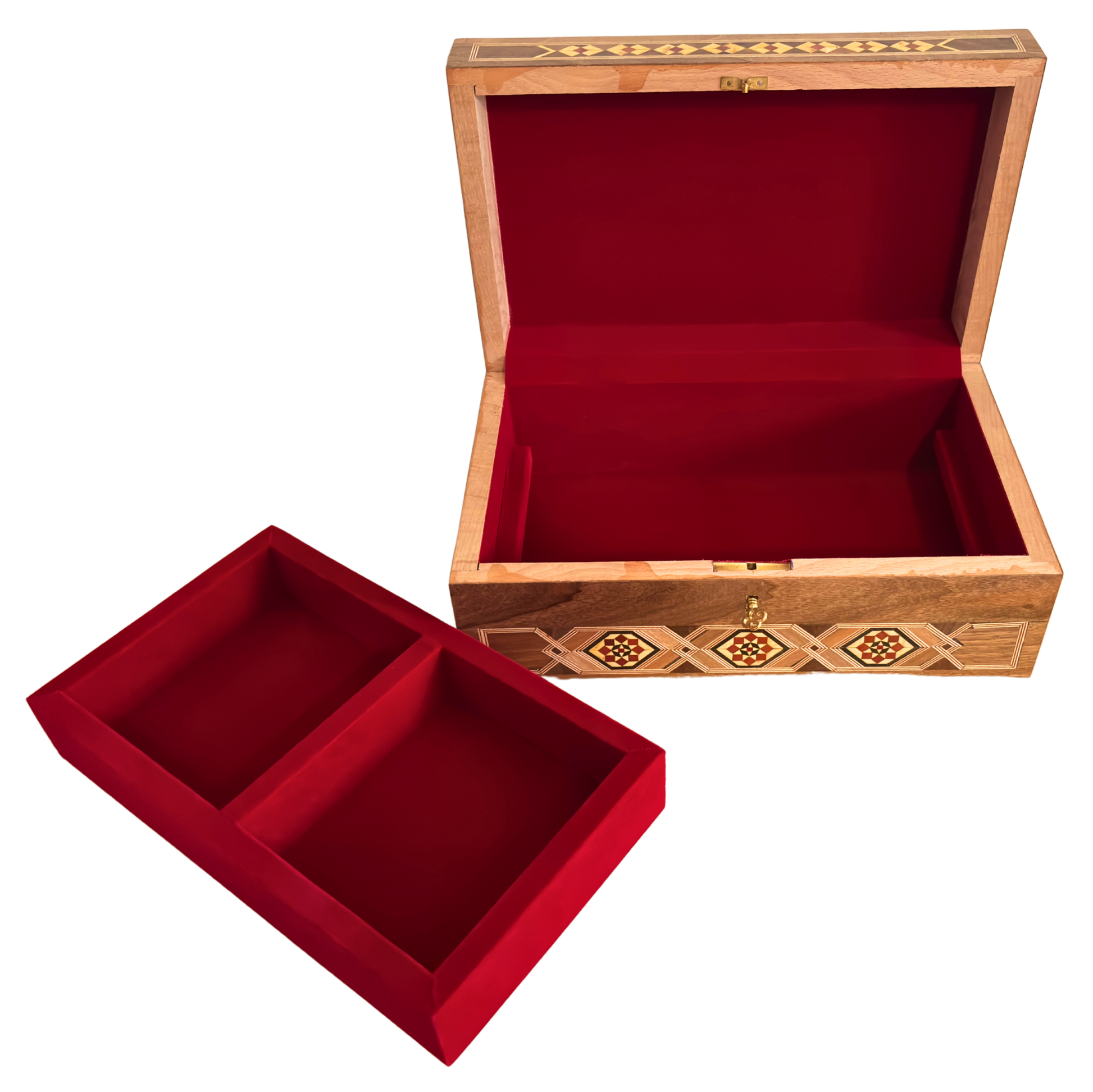 Cette grande boîte mosaïque damascène faite main est une véritable œuvre d’art, soigneusement réalisée à partir de bois naturel de noyer, hêtre, citronnier et pin jaune de qualité supérieure, et délicatement incrustée de nacre brillante et de motifs géométriques complexes selon des techniques ancestrales. Son intérieur multiniveau offre un rangement élégant et sécurisé pour bijoux, montres, souvenirs et précieux moments, tous protégés par une serrure classique avec clé.