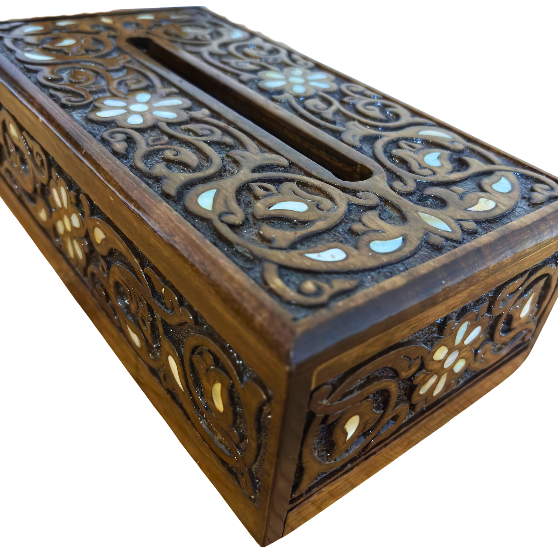Portafazzoletti in Faggio Intagliato a Mano con Madreperla – Finitura Noce Elegante